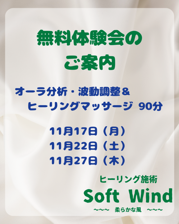 無料体験会のご案内:オーラ分析・波動調整&ヒーリングマッサージ90分